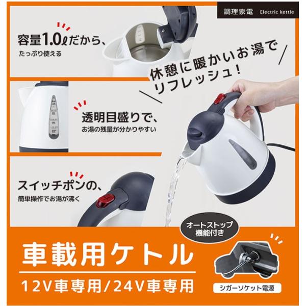 トラックに 大容量1リットル24v用カーケトル 24vカーポット お湯が沸く 車でお湯が沸く キャンピングカーポット 長距離トラックの夜食に