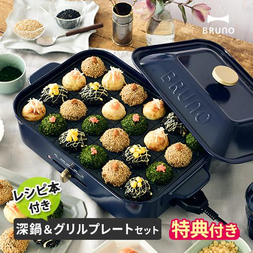 bruno ブルーノ コンパクトホットプレート 本体 プレート3種 たこ焼き セラミックコート鍋 平面 レシピブック 付き ブルーグレー blue gray おすすめ おしゃれ かわいい これ1台 一台 蓋 ふた付き 1200w 温度調節 洗いやすい 1人 2人 3人 用 小型 ひとり暮らし