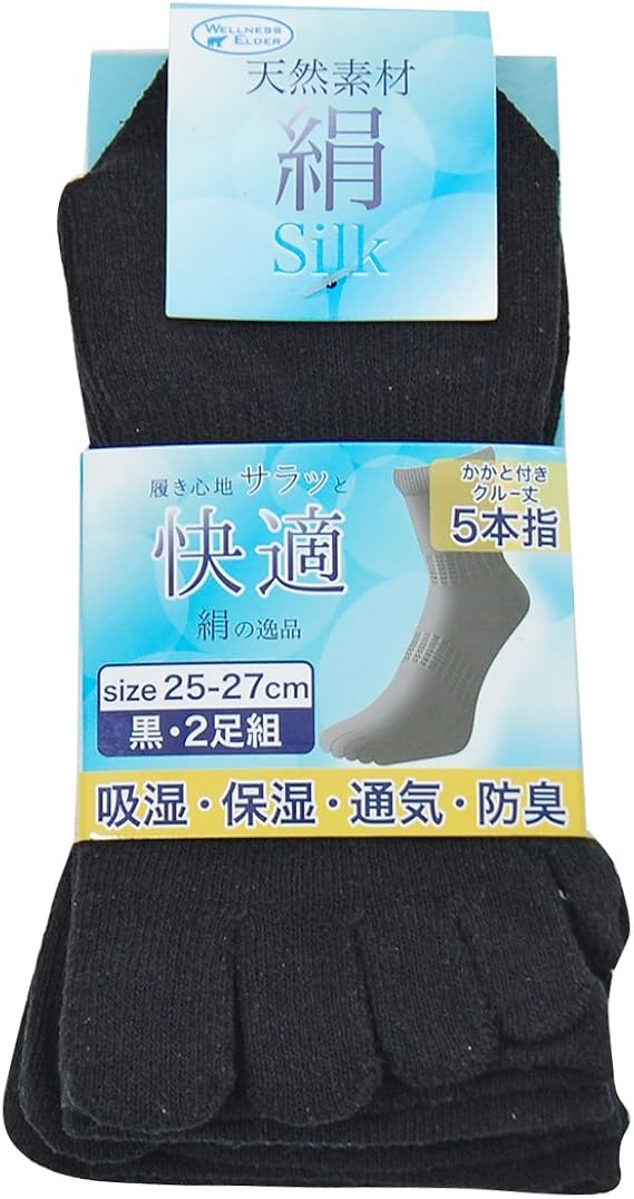 靴下 メンズ 絹 シルク 履き口ゆったり 5本指 ソックス クルー 黒色 2足組 690