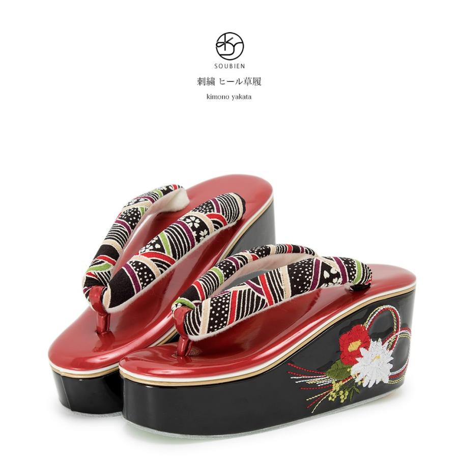 ソウビエン 草履 赤 レッド 白 梅 うめ 花 刺繍 四枚芯 太鼻緒 厚底草履 振袖 成人式 卒業式