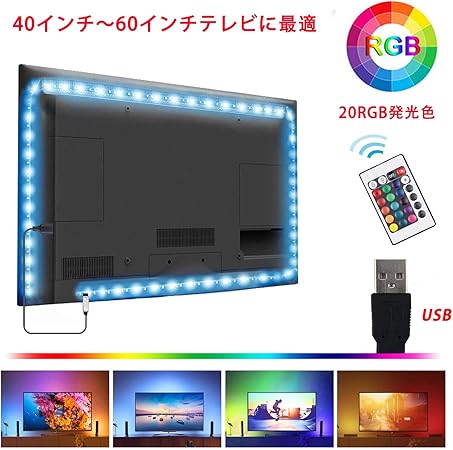 amazon ledテープライト 2m フルカラー tvバックライト ip65 防水防塵 20色切替60連 usb接続 テレビ pc照明 切断可能ledテープ rgbライト 高輝度 5v電圧 フルカラー 車外装飾 強粘着両面テープ リモコン付き ledテープ 車 バイク